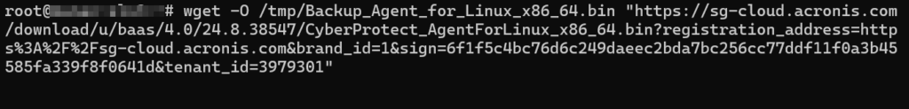 wget -O /tmp/Backup_Agent_for_Linux_x86_64.bin "https://sg-cloud.acronis.com/download/u/baas/4.0/24.8.38547/CyberProtect_AgentForLinux_x86_64.bin?registration_address=https%3A%2F%2Fsg-cloud.acronis.com&brand_id=1&sign=6f1f5c4bc76d6c249daeec2bda7bc256cc77ddf11f0a3b45585fa339f8f0641d&tenant_id=3979301"