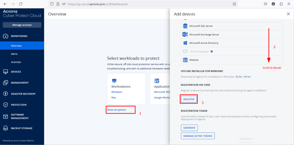 - Setelah berhasil masuk ke portal Kilat Protect, langkah pertama untuk melindungi perangkat Anda adalah melakukan registrasi Agent. Untuk mendaftarkan perangkat Anda agar dapat dikelola oleh Kilat Protect, kunjungi halaman Overview, lalu pilih Show All Options, gulir ke bawah, dan klik Register pada opsi Registration Via Code atau Jika Anda ingin menambahkan device lain, maka Anda dapat memilih halaman Device kemudian Pilih + Add.