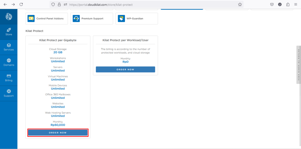 - Pada halaman order Kilat Protect, nantinya Anda akan ditawarkan dua model pembelian: per Workload/User dan per Gigabyte. Model per Workload/User menghitung berdasarkan jumlah total beban kerja (server fisik, workstation, mesin virtual, dll) dan penyimpanan cloud yang digunakan, cocok untuk pelanggan dengan sedikit beban kerja yang membutuhkan perlindungan dan jumlah data besar per beban kerja. Sementara itu, model per Gigabyte dihitung berdasarkan total penyimpanan cloud dan lokal yang digunakan, tanpa batasan jumlah perangkat yang dapat dilindungi, sehingga ideal untuk pelanggan dengan banyak perangkat dan data kecil per beban kerja. Kedua model ini memiliki kelebihan masing-masing, dan pilihan yang tepat akan bergantung pada kebutuhan serta pola penggunaan Anda. Pada knowledge base ini, kami menggunakan pilihan Kilat Protect per Gigabyte. Selanjutnya, klik "Order Now".