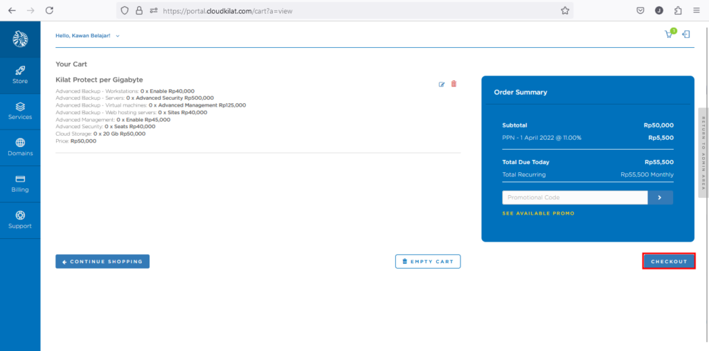 - Masuk ke halaman cart dan pilih "Checkout".