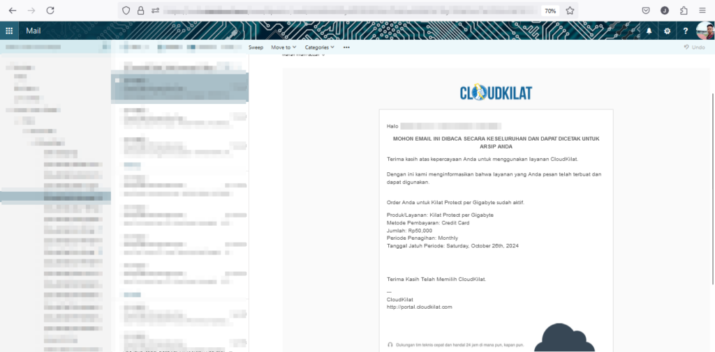 - Setelah pembayaran dilakukan, Anda akan menerima email informasi akun baru dengan subjek "[CloudKilat] Informasi Akun Baru".