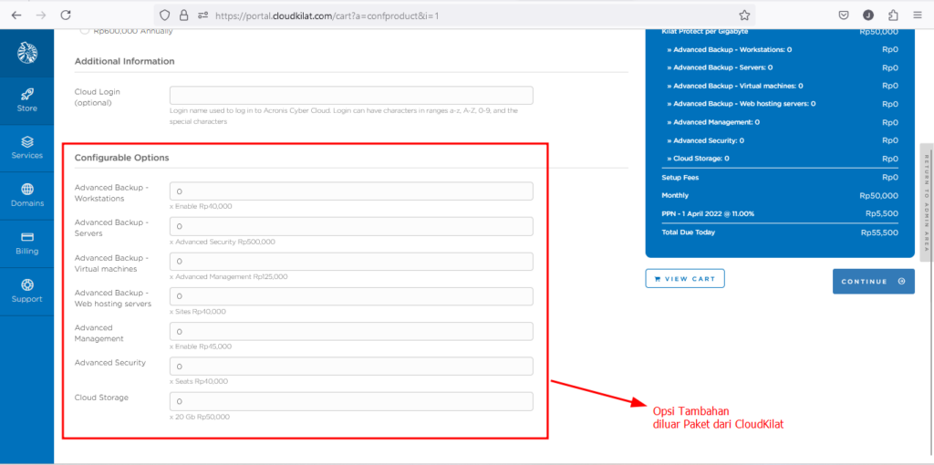 Untuk informasi opsi konfigurasi ini memiliki harga yang bermacam" dan informasi harga pada bagian bawah layanan adalah harga peritem dan apabila Anda sudah yakin silakan klik "Continue".