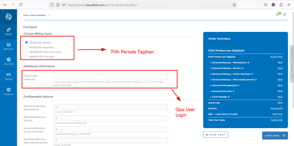 - Setelah itu Anda akan diarahkan ke halaman konfigurasi untuk menentukan periode tagihan, User Login, dan Paket Tambahan apabila Anda membutuhkan.