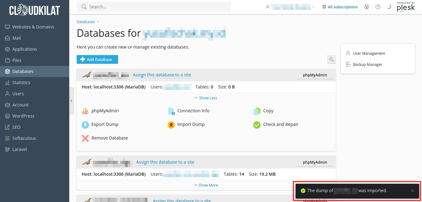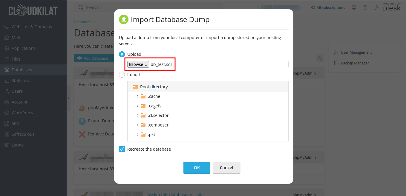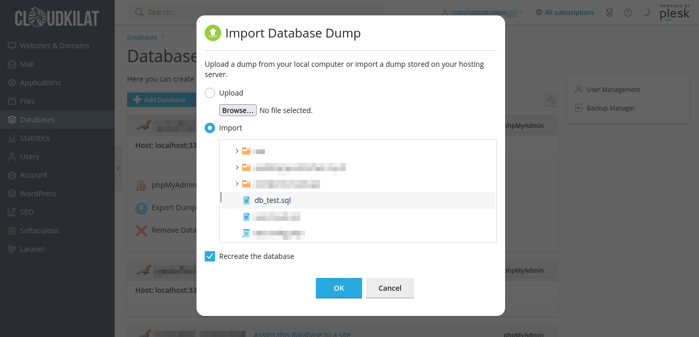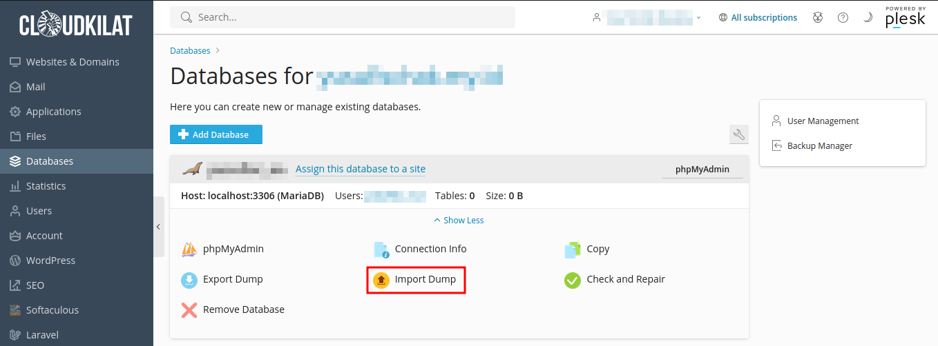 Gambar 9: Tombol Import Dump pada Plesk layanan Kilat Hosting 2.0