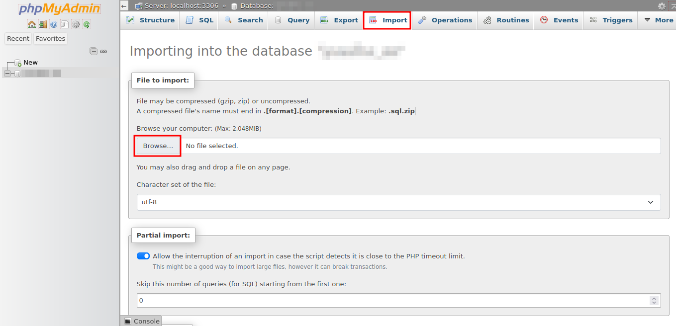 Gambar 4: Tab Import dan tombol Browse pada phpMyAdmin